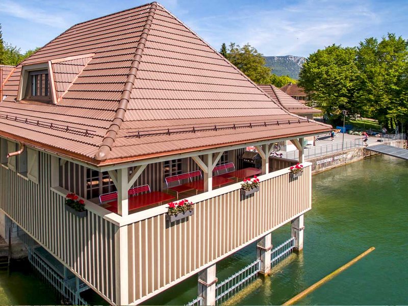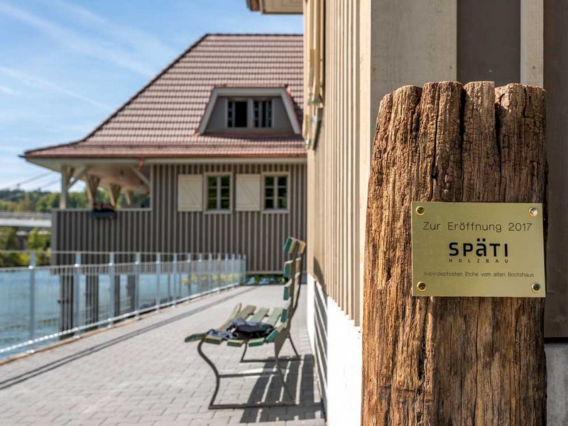 Kein Wunder also, dass das Bootshaus heute, ein Jahrhundert später, in seinem ursprünglichen Heimatstil mit denselben Dimensionen auftritt. Charakteristische Merkmale wie das steile Walmdach sowie die repräsentative, über den Fluss herausragende Altane des Kopfbaus und das schlanke Volumen des Bootslagers zeichneten den Bau aus. All diese Elemente finden sich in dem Neubau heute wieder. holzbauing.ch, phalt.ch, spaeti-holzbau.ch
