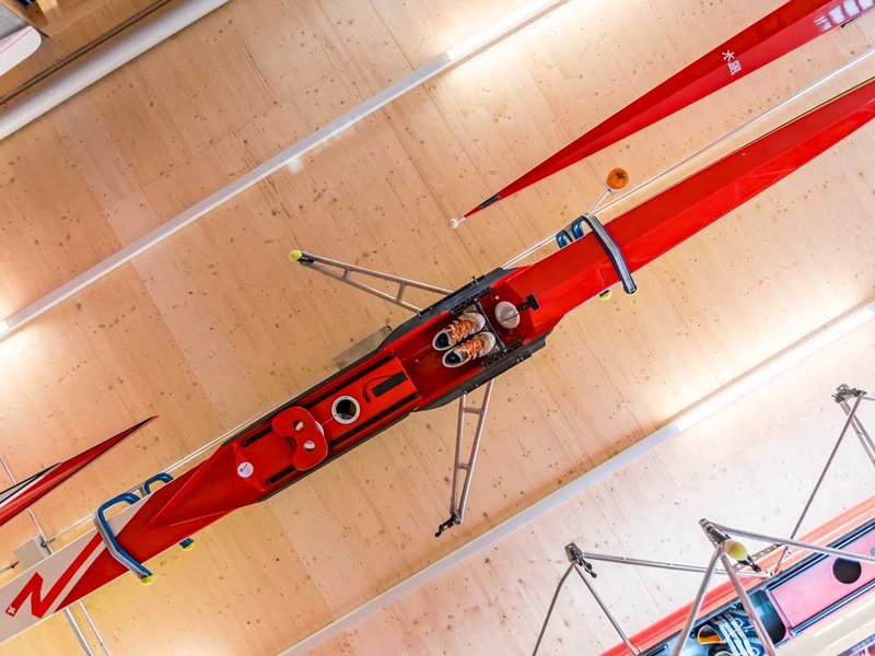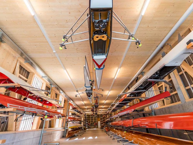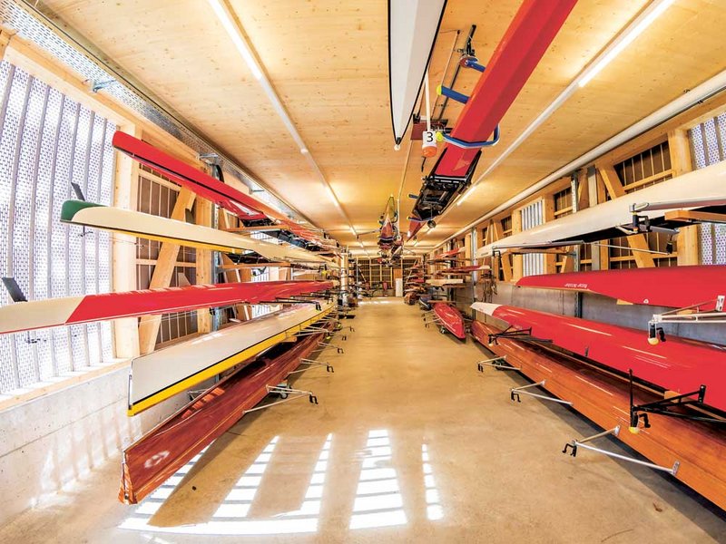 Wenn Peter von Däniken heute zum Rudern antritt, dann mit deutlich mehr Komfort. Auf Erdgeschossebene gelangt er direkt in die lang gezogene Bootshalle. Durch die gelochten Fensteröffnungen dringt warmes Licht nach innen, LED-Röhren an der Decke erhellen den Raum zusätzlich. An den Wänden liegen die eleganten schmalen Ruderboote in ausziehbaren Regalen übereinander. Auch an der Decke finden sich entsprechende Hängevorrichtungen für kleinere Boote.
