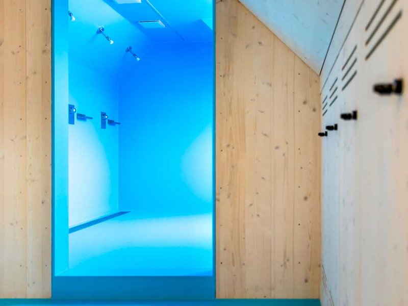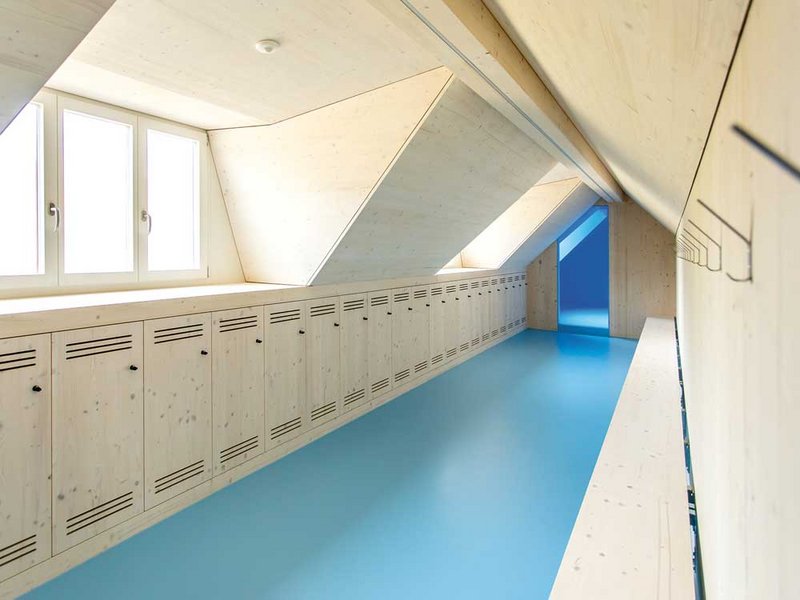 Nach dem Training kann sich Peter von Däniken heute tatsächlich auf eine warme Dusche freuen, die direkt mit der Garderobe verbunden ist. Die Garderoben sind geschlechtergetrennt organisiert und werden modernen Ansprüchen gerecht. Den Ruderer erwartet ein lang gezogener, heller Raum, beheizt und mit massgefertigten Einbauschränken aus Holz für die Wertsachen. Lukarnen lassen Tageslicht eindringen. Die Phalt Architekten AG setzte auf eine starke Farbsprache mit dem hellen und warmen Braun des Fichtenholzes an Wand und Schränken und dem kräftigen Blau, das sich vom Boden in der Garderobe bis in die Nasszelle zieht – ein fugenloser Polyurethanbelag. Die Toiletten befinden sich jetzt neu auch auf der Ebene der Garderoben im Dachgeschoss. Das war zuvor nicht so. Sie lagen wie auch die Gemeinschaftsduschen in dem kleinen Anbau an das Bootslager ausserhalb des Clubhauses.