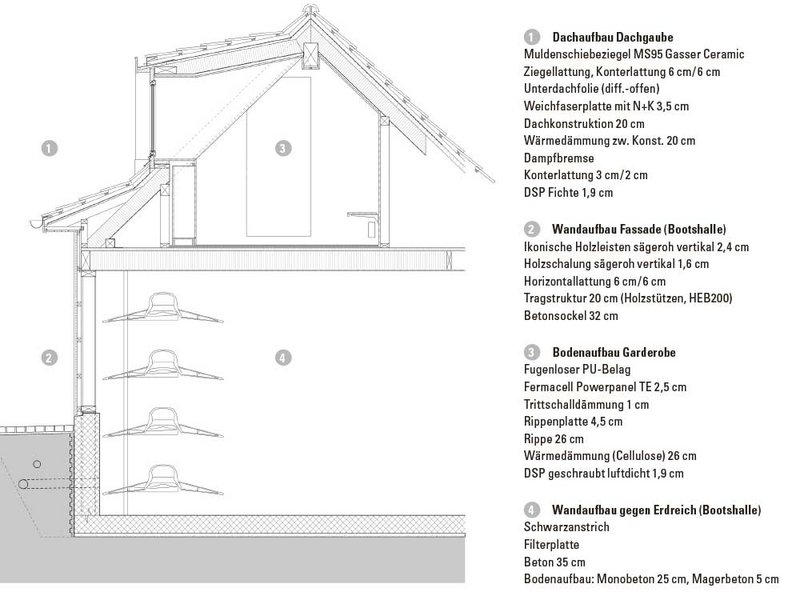 Fünf liegende Schleppgauben ergänzen die nordseitige Dachfläche des Bootshallentrakts. Sie sorgen für die natürliche Belichtung und Belüftung des Dachraums. Die Längsfassaden wurden partiell geöffnet, um Ein- und Ausblicke in die Bootshalle zu gewähren. Die Fensterelemente aus Lochblech rhythmisieren zusammen mit den breiten Deckleisten den langen Baukörper und verleihen der Aussenhülle eine starke Tiefenwirkung. Die für den Heimatstil typische Farbigkeit adaptierte das Architekturbüro und setzte sie verfeinert um. Die schmalen, hell gestrichenen Deckleisten wurden durch breite Holzschalungen im Rhythmus der dahinterliegenden Holzstützen ergänzt. Sie prägen im Kontrast zu der dunkleren Holzschalung und den neuen Öffnungen die äussere Erscheinung. Um die Wirkung der Räume zu stärken und um der Anforderung der Bauherrschaft nach einer unprätentiösen und robusten Materialisierung gerecht zu werden, wurde der Innenausbau bis auf die Nasszellen und den Bodenbelag der Garderoben mit einem einzigen Material ausgeführt: gelaugte und geseifte Dreischichtplatten.