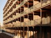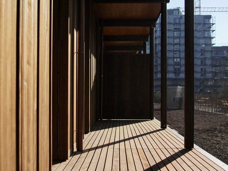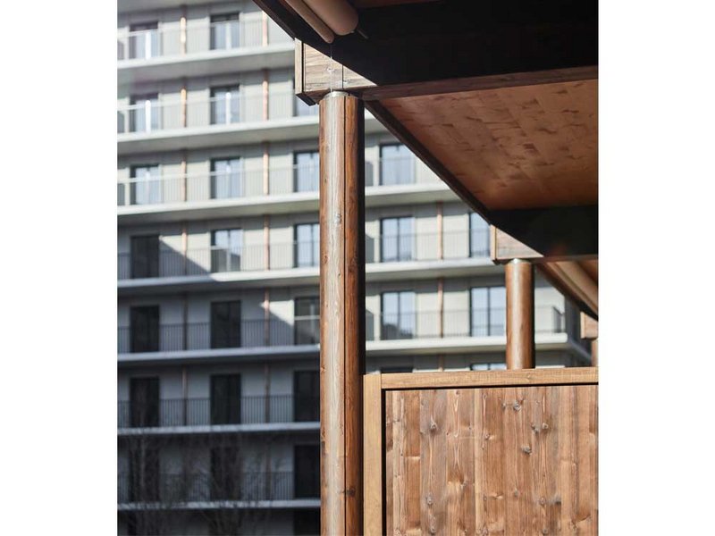 "Woodstock" hat Architekt Rolf Mühlethaler die drei Langhäuser im Minergie-P-Eco-Standard getauft. Damit setzte sich der Berner im Wettbewerb durch, der zwar die Form der Gebäude vorgab, die Materialität jedoch offenliess. Mit seinem Entwurf von den länglichen Holzbauten brachte er das Holz ins Freilager. "Inspiriert haben mich die alten, langen, hölzernen Lagerhäuser auf dem Areal." Das sichtbare Holz – Fassadenelemente, Säulen und Holzroste – besteht aus Schweizer Weisstanne. Im Inneren ist vom Holzbau aus brandschutztechnischen Gründen nichts zu sehen. Das Konstruktionsholz stammt aus den Alpenländern und umfasst Tanne, Fichte sowie Brettsperrholz und Brettschichtholz. Die Aussen- und Innenwände tragen die Geschossdecken aus Brettstapelholz. Ob für Familien, Wohngemeinschaften, Paare oder Singles – die unterschiedlichen Grundrisse der Wohnungen ermöglichen alle Lebensentwürfe unter einem Dach. Sie setzen sich aus den immer gleichen, vorfabrizierten Elementen zusammen, die sich auf den sechs Geschossen stapeln. Der Abschluss wird nicht durch ein Attikageschoss gebildet. Mühlethaler ist damit dem Gedanken der sozialen Durchmischung gefolgt, der sich an einem thronenden Attikageschoss stossen würde.