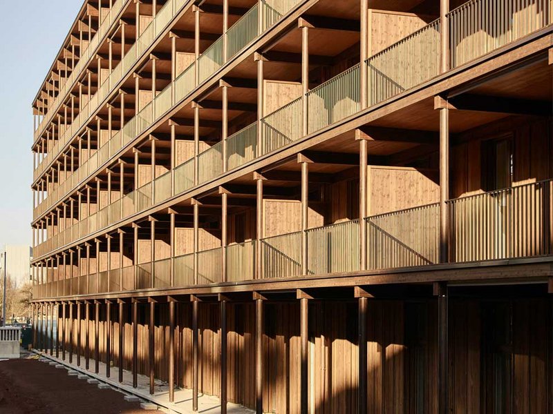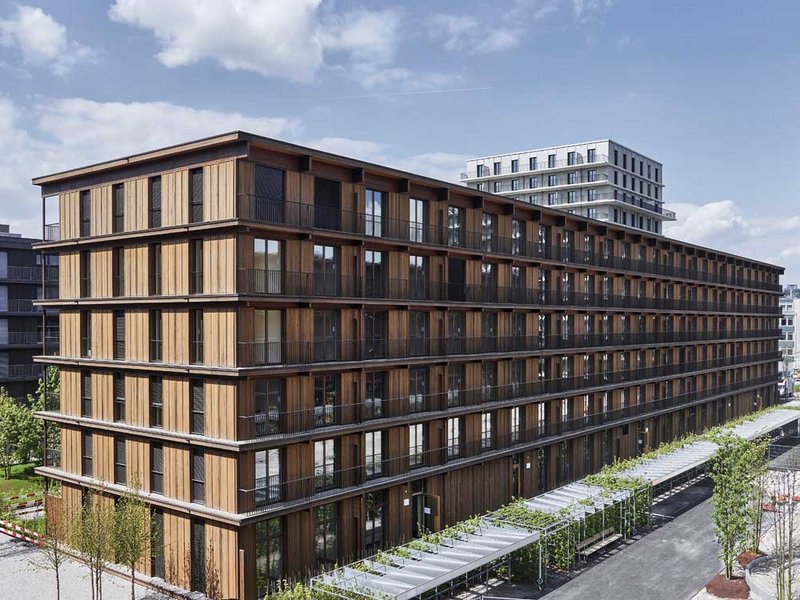 "Diese Gebäude darf man durchaus als ein Leuchtsignal für die städtebauliche Zukunft sehen", sagt Matthias Kaufmann von der Renggli AG. Er begleitete als Projektleiter die Produktion und Montage der drei Holzbauten im neuen Quartier Freilager Zürich, das im Sommer eröffnete. "Es bietet auf einer Fläche von 70 500 Quadratmetern Platz für eine der grössten und ambitioniertesten Überbauungen des Landes." Das Quartier im Stadtteil Albisrieden setzt sich zusammen aus zwei aufgestockten Altbauten und zehn Neubauten – drei davon sind die Langhäuser mit rund 130 Wohnungen. Die von Architekt Rolf Mühlethaler entworfenen Langhäuser sind reine Holzsystembauten, lediglich der Treppenhauskern besteht aus Beton. Mit sechs Stockwerke, 20 Metern Höhe, 18 Metern Breite und einer Länge von 70 und 90 beziehungsweise 100 Metern ist dieser Auftrag der grösste, den die Holzbauunternehmung Renggli AG je umgesetzt hat. "Es macht uns stolz, dass wir unseren Beitrag im Holzbau leisten konnten. Auch bezogen auf die Fassade und die Balkone, die wir in Schweizer Holz umgesetzt haben", sagt Kaufmann. Holzbauingenieure waren Indermühle Bauingenieure aus Thun.