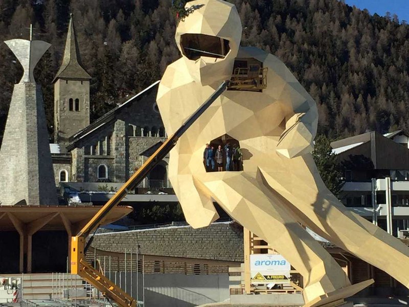 Vom Ski bis zum Helm misst Edy stolze 19 Meter. Vorbild und Namenspatron der Skulptur ist der Schweizer Skirennfahrer Edy Reinalter, der bisher als einziger Schweizer die Olympiamedialle im Slalom holte – 1948 bei den Olympischen Winterspielen in seinem Heimatort St. Moritz. Edy in Holz posiert in schnittiger Kurvenlage. Damit er dabei nicht umkippt, stützt ihn ein zwölf Meter hoher Holzturm, der sich hinter seinem Rücken versteckt. Der Turm ist nicht nur Stütze, sondern zugleich auch Treppenhaus und Zugang für die verschiedenen Plattformen im Inneren. Die Hülle ist aus über 600 per CNC-Technik zugeschnittenen Holzdreiecken zusammengesetzt. Die digitale Planung führte das Zürcher Büro Design-to-Production durch, so dass aus dem detaillierten digitalen Modell direkt die Fertigungsdaten für den computergesteuerten Zuschnitt erzeugt werden konnten. Für die fast eintausend individuellen Verbindungen an den Kanten wurden parametrische Details entwickelt, die sich präzise vorfertigen und damit sehr einfach montieren liessen. Durch eine ausgeklügelte Nummerierung und umfassende Informationen auf den ausgefrästen Platten konnte der Skifahrer in nur drei Wochen aufgestellt werden.