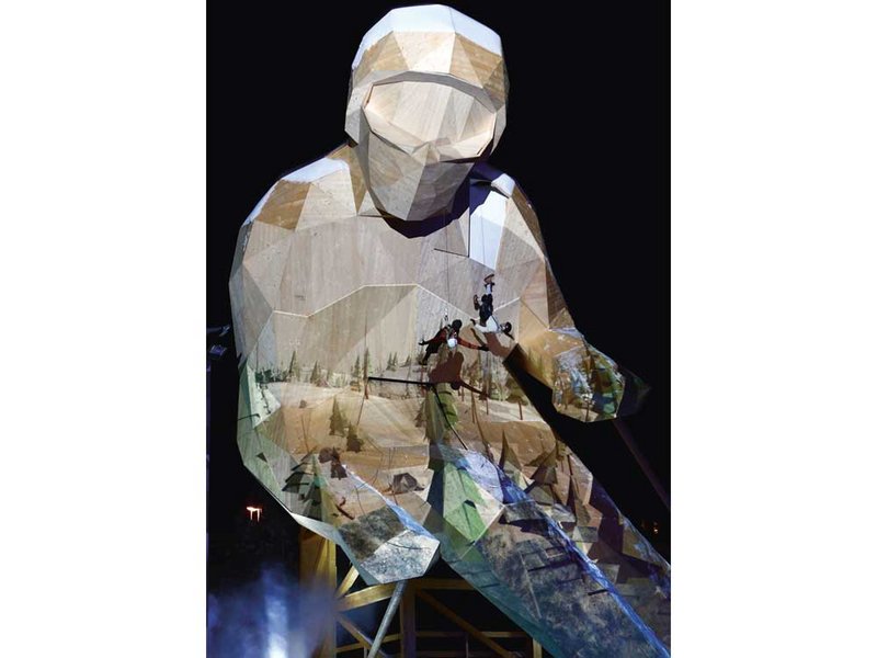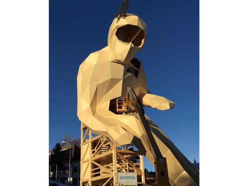 Edy ist 19 Meter gross und besteht von Ski bis Helm aus Fichte. Er war die Symbolfigur der Ski-WM.