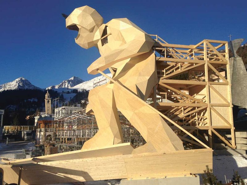 Die 637 Dreiecksflächen, aus denen die Skulptur besteht, waren sehr präzise zugeschnitten und beschriftet. Das hat uns zeitlich in der Vorfertigung in die Karten gespielt, da wir sehr zügig arbeiten konnten. Das dazugehörige Laufblatt informierte exakt, an welcher Kante welches Dreieck anzubringen war. Somit musste keine Zeit damit verschwendet werden, die Elemente zusammenzusuchen. Bei der Montage vor Ort, im Kulm Park St. Moritz, fanden wir nahezu ideale Bedingungen vor: genügend Platz für den Aufbau und fast jeden Tag Sonnenschein. Mithilfe eines Krans und von Lasertechnologie wurden die Teile dann im korrekten Winkel montiert.