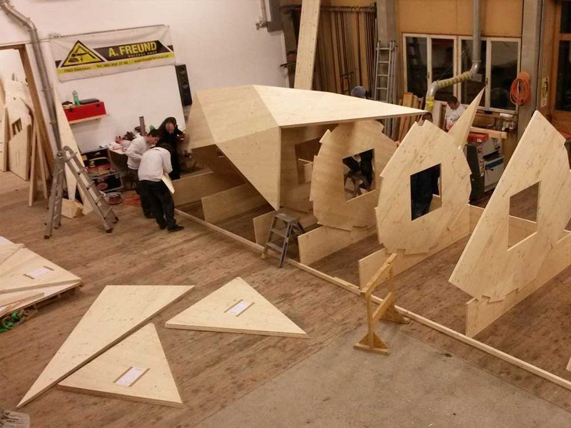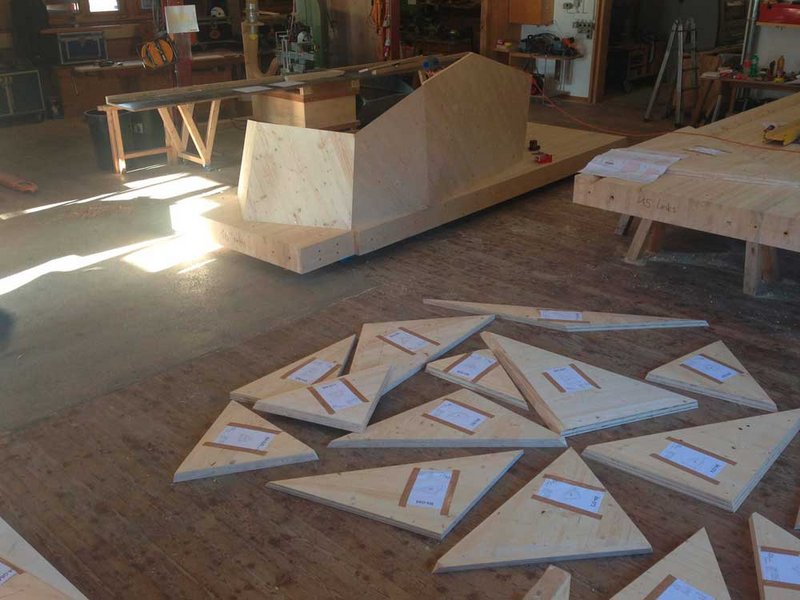 Die dreieckigen Holzelemente wurden in der Werkstatt der A. Freund Holzbau GmbH zu 22 Körperteilen vormontiert und erst auf der Baustelle zusammengesetzt. Bei der Segmentierung mussten sowohl statische Anforderungen als auch das maximale Transportvolumen und der Montageablauf berücksichtigt werden. Zur Qualitätssicherung und um die Montage zu vereinfachen, wurden direkt beim Zuschnitt Laufzettel mit allen nötigen Informationen auf die Bauteile geklebt: Für jedes Dreiecks-Paneel wurden Bauteilnummer, Körperteil, Nachbarpaneele, Masse, Winkel sowie Verbindungstypen angegeben. Intensive Vorbereitungen wie diese machten den Skifahrer zu einem einfachen Montagebausatz.