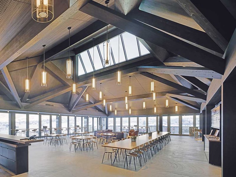 Die Dachkonstruktion manifestiert die Kompetenz lokaler Zimmermannskunst. Sie formt die Faltwerke der Schulungsräume und des Verpflegungsraumes zu einem imposanten Dachstuhl, der elegant und simpel die immensen Auskragungen in eine Stabkonstruktion einwebt. Die grosse Flächensteifigkeit des pyramidalen Faltwerkes erlaubt eine punktuelle Auflagerung auf wenige Stützen. An den nördlichen Flächen der Faltwerke sind Oblichter zur optimalen Ausleuchtung der Schulungsräume mit Tageslicht eingelassen. Wer den Blick über die Fassade schweifen lässt, der erkennt, dass der Raumabschluss gegenüber des Tragwerks leicht zurückgesetzt ist. Die aussen platzierten, freigestellten Stützen erlauben dennoch eine umfassende Aussicht auf das Panorama.