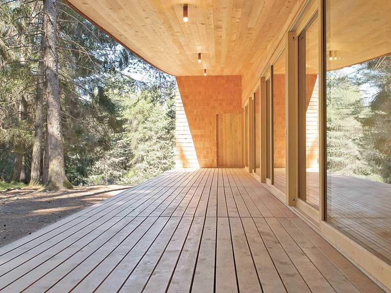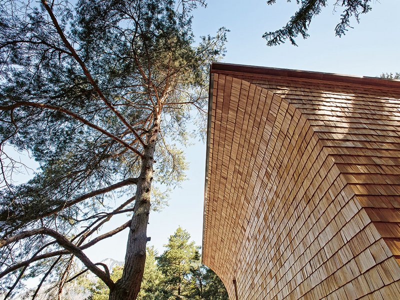 Die geschlossene seitliche Wandfläche hat in der Mitte ein tiefes Loch. Über ein paar Treppenstufen führt diese Durchdringung ins Innere zum grossen zentralen Raum, zum grossen Saal. Eine Doppelreihe aus grossen, eigentlich überdimensionierten Pfeilern steht sozusagen Spalier. Jeder Besucher kann sich erstmals der starken Präsenz des Materials kaum entziehen. Es erinnert zudem an sakrale Erhabenheit: Wie ein Mittelschiff ist der grosse Raum von den zwei Pfeilerreihen eingefasst. Bei der Eingangsseite auf der Ostseite schliesst sich ein Gang an, wo sich Nebenräume und eine kleine Küche befinden. Die westseitige Längsfassade zum Wald hin ist transparent und offen. Die davorliegende, gedeckte Terrasse, als Bindeglied und Übergang zur Natur, ist über grosse Schiebefenster erreichbar. Dazu Gion Caminada: «Die bodennahe Terrasse ist ein gebauter Aussenraum zwischen dem Kulturraum des Hauses und dem Naturraum des Waldes. Keine Panoramasicht stört die Beziehung zwischen dem architektonischen Raum und der Landschaft. Die Durchsicht und die Enge wirken gleichzeitig als Befreiung und Einschränkung.» Die Trennung von Natur und Kultur scheint aufgehoben: Man fühlt sich drinnen und draussen. Das Licht dringt zwischen den Bäumen hindurch in den Raum und wirft lange Schatten auf den Riemenboden. Die leichten Unebenheiten und die Poren der Holzoberflächen werden vom einfallenden Licht fein modelliert. Die zwei Bögen für Dach und Stirnfassade prägen die einfache, aber prägnante Form. Handgefertigte Lärchenholzschindeln kleiden die Tegia da vaut sinngerecht ein. «Es geht mir auch darum, das Selbstverständliche, das oft in die Unsichtbarkeit zu verschwinden droht, aus seiner paradoxen Lage herauszulösen», erklärt der Meister traditioneller Baukultur, und weiter: «Mit den übergrossen Pfeilern wird der Raum in unserer Wahrnehmung stärker geschlossen.» Caminada verleiht dem Material Holz eine besondere Präsenz. So zum Beispiel auch durch die offenen, unbehandelten, sägerohen Holzoberflächen mit ihrer eigenen, welligen Rhythmik, die ebenfalls zu Projektionsflächen unserer Sinne werden. Der Architekt: «An einem Ort wirkt das Holz geschichtet und schwer, an einem anderen ist es gewebeartig eingesetzt und erzeugt Leichtigkeit. Die Detaillierungen wollen nicht auffallen, sondern einfach dazugehören – sie möchten Teil einer Ganzheit sein.»