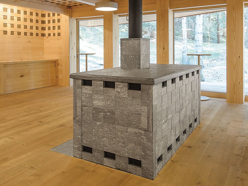 Nochmals zurück ins Innere. Beim Eintritt über die erweiterte Garderobennische fällt dem Besucher sofort der aus grauem Hinterrheingranit schlicht gestaltete und sozusagen frei dasitzende Kachelofen auf. Zwei Meter tief, ein Meter breit und knapp ein Meter hoch. Auch da ein mit dem Ofenbauer entworfenes und konstruiertes Unikat, das für eine einwandfreie Funktion einiger kleiner Anpassungen bedurfte. Dieser in der Raumbreite mittig und auf der Raumlängsseite im ersten Drittel dasitzende Steinkörper verleiht dem Raum mit den einfachen Holztischen und -stühlen die bereits beschriebene spezielle Atmosphäre. Caminada erklärt es so: «Das aufsteigende Kaminrohr zeigt seine Rolle als Feuerstelle an. Die Wärme, die vom Ofen ausgestrahlt wird, gewinnt durch das Nähertreten an Intensität. Man spürt, dass die Luftbewegungen nur mässig sind. Die Luftmasse bekommt durch die Ruhestellung eine Schwere. Die gefühlte Speckigkeit möchte man auf Händen tragen.» Die Auskleidung der beiden Sanitärräume ist aus dem gleichen Steinmaterial wie der Ofen. Apropos Ofen. Auf der hinteren, waldseitigen 1,3 Meter überdachten Aussenrückwand ist mittig eine Feuerstelle, ein ebenso einfacher wie funktionaler Grillofen aus Stahl, angebaut – daneben ein schlichtes, kistenartiges Brennholzlager.