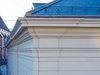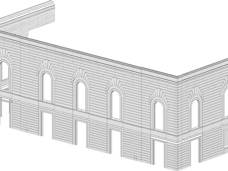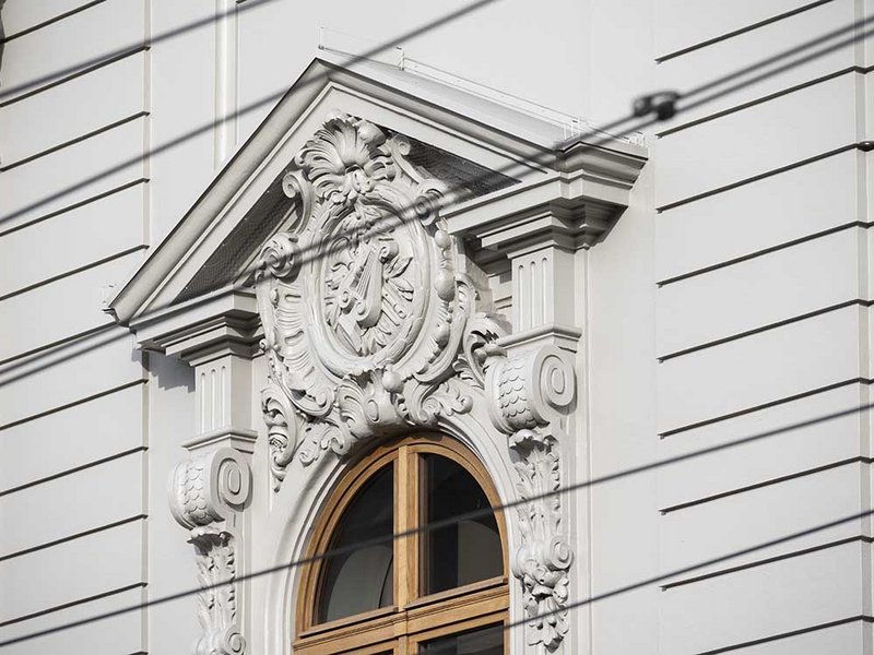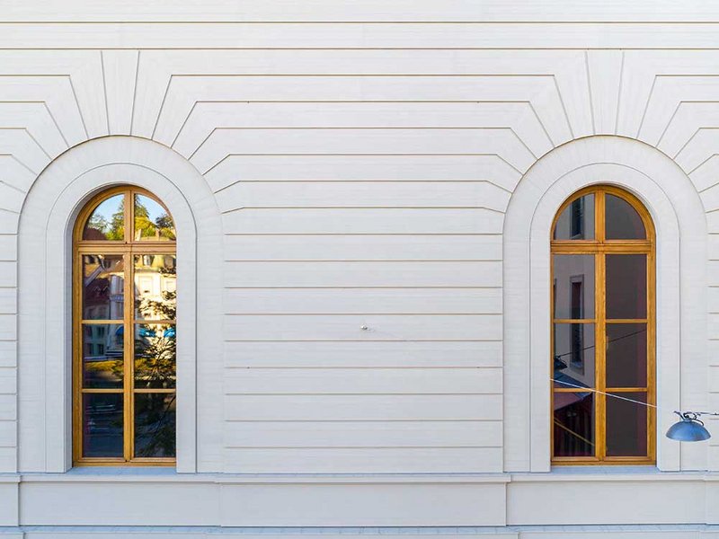 Selbst die Stürze der sieben Rundbogenfenster waren aufgrund der Bautoleranz des Baumeisters unterschiedlich, obwohl auf den Plänen gleich. Die Unterkonstruktion der Erweiterung ist eine 35 Zentimeter starke Betonwand mit Steinwolle (28 cm) homogen gedämmt. Darauf folgte die Unterkonstruktion für die äussere Schalung. Sie übernimmt das Fugenbild der historischen Fassade, das um Millimeter variiert. Jedes Steinband ist mit drei Holzbrettern nachgebaut, die miteinander verleimt oder verschraubt sind. «Die Fensterleibungen konnten wir erst nach der Montage der Fenster einmessen, vor Ort anpassen ging nicht, weil die Schnittstellen farbbehandelt sein mussten», erklärt Schneider das Vorgehen. In der Verkleidung, die einen Sturz in Mauerwerk vorgibt, liegt Kunsthandwerk in Puzzleform verborgen. Die abgewinkelten Bretter – herausgelöst erinnern sie an Hockeyschläger – mussten haargenau und symmetrisch stimmen.