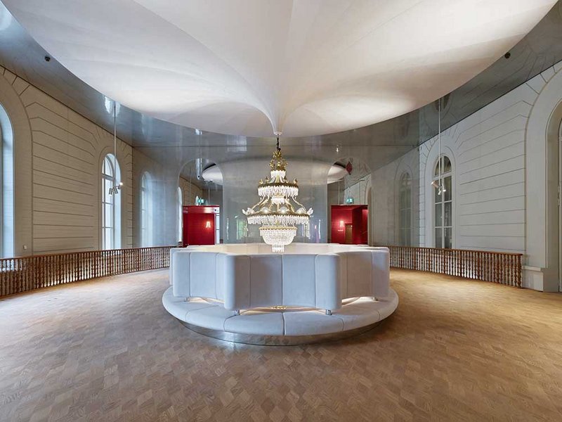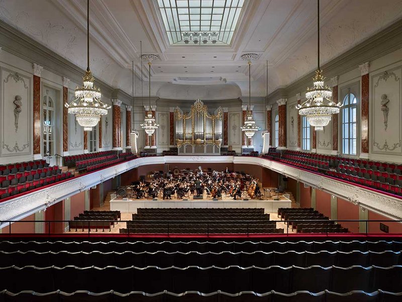 Mit dem Umbau, der letzten Juni fertiggestellt wurde, lösten Herzog & de Meuron den Musiksaal vom Casino los und erweiterten ihn Richtung Barfüsserkirche. Die Basler Architekten haben sämtliche Entwürfe, die an den Musiksaal andockten, als lächerliche Bastelarbeit verworfen und den bereits 1876 als Palazzo konzipierten Baukörper als solchen freigespielt. Im Innern erlebte das Gebäude die Jahre hindurch eine Vielzahl von Veränderungen: Wände, Stuck, Mobiliar, Leuchten wechselten ihre Farbtöne und Materialien. Die akustische Qualität hingegen blieb immer auf höchstem Niveau. Im Rahmen der Erweiterung renovierten die Architekten zusammen mit der Denkmalpflege auch den Musiksaal. Als oberste Vorgabe wurde der Erhalt der akustischen Eigenschaften definiert, ferner das möglichst originalgetreue Zurückführen des Saals in seine ursprüngliche Form. Das Oblicht und die Seitenfenster wurden wieder geöffnet, die Bestuhlung für 1400 Zuhörerinnen und Zuhörer wurde nachgebaut, die Neigung des Balkons verringert, das Parkett in seiner ursprünglichen Form ersetzt und die Farbgestaltung wiederhergestellt. Zur Erschliessung des oberen Geschosses haben die Architekten herrliche Treppen gestaltet. Auf den ausufernden Podesten staunt man in die Höhe und die Tiefe und hält sich am kunstvoll geschliffenen Holzhandlauf fest, damit man nicht im satten Rot der Tapeten versinkt.