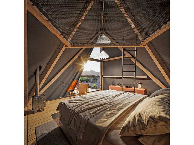Insgesamt beläuft sich die Grundfläche des Zelts auf knapp 18 Quadratmeter, wobei die Spitze über viereinhalb Meter in die Höhe ragt. Im Innenraum entsteht so ein luftiges, grosszügiges Volumen. Auf Wunsch umfasst die Einrichtung auch eine Netzbespannung für Gepäck, eine Leiter und ein Bett mit Kopfteil. Die kleine vorgelagerte Terrasse, die Teil des Holzfundaments ist, erweitert das Zelt in den Aussenbereich.