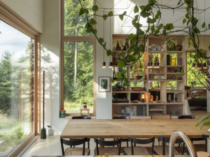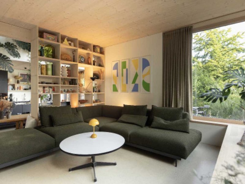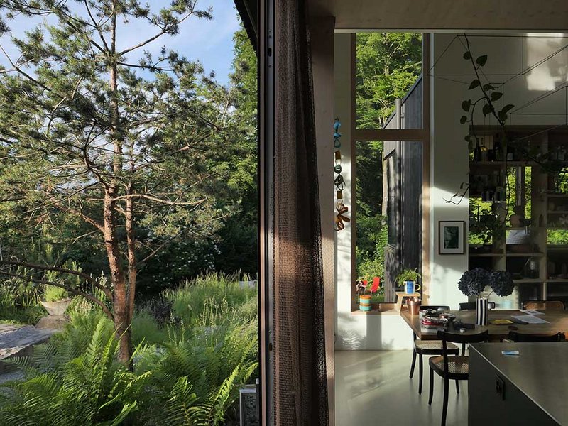 Trotz der vielen hohen Bäume wirkt das Haus im Inneren ausgesprochen hell – was auch an den Oblichtern liegt, die sich über die beiden Maisonette-Wohnungen verteilen. Insgesamt sind es zwölf an der Zahl. Dass überhaupt so viele eingeplant werden konnten, ist dem architektonischen Konzept geschuldet: Das Gebäude besteht aus verschiedenen Volumen, die zueinander versetzt sind und – der Topografie folgend – auch in der Höhe variieren. Im Inneren des Gebäudes entsteht dadurch ein abwechslungsreiches Raumgefüge, das unterschiedlichste Perspektiven offeriert. So sind beispielsweise die Fenster mit filigranem Holzrahmenprofil so konzipiert, dass sie tiefe Sitznischen bilden, von denen man gemütlich in die Natur schauen kann. Die integrierten Regale und Schubfächer darunter bieten gleichzeitig kostbaren Stauraum, von dem man in der Regel nicht genug haben kann. In diesem Fall, so gesteht der Bauherr, seien aber immer noch Schubladen leer.
