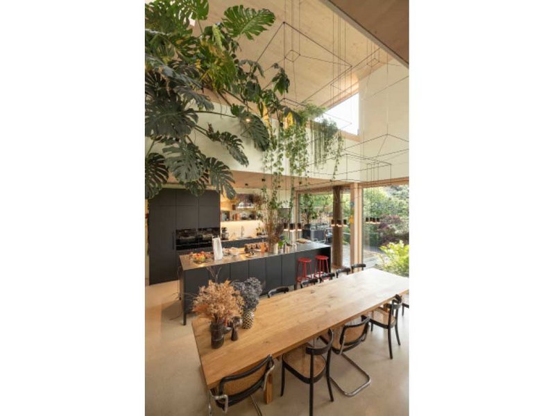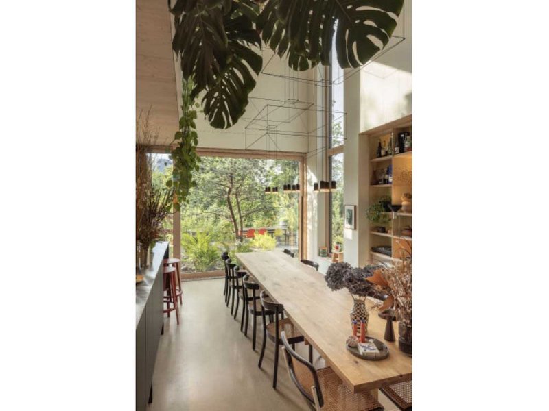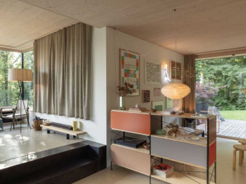 Schon beim Rundgang ums Haus wird deutlich, wie eng der Bauherr David Zangger mit diesem Ort verbunden ist. Bevor er vor drei Jahren hier neu baute, stand das Haus der Grosseltern dort – ein Holzbau, den einst der Schweizer Anthroposoph Willy Stokar (1893–1953) in den 1930er Jahren erbaute. David Zanggers Grossvater – der Architekt Hans Zangger (1929–2011) – wollte irgendwann selbst neu bauen, so zumindest war der Plan. Daraus wurde allerdings nichts. Stattdessen hatte er das alte Stokar-Haus umgebaut und renoviert. Bis vor wenigen Jahren stand es noch genau an jener Stelle, wo heute das Mehrfamilienhaus seines Enkels steht. Seit drei Jahren wohnt dieser nun mit seiner Frau und den beiden Kindern dort. Genauer gesagt in einer der drei Wohnungen, die hier entstanden sind. In den anderen beiden wohnt sein Bruder Jonathan, Innenarchitekt, und eine befreundete Familie. «Für mich und meine kleine Familie wäre das Grundstück einfach zu gross gewesen. Und gleichzeitig wünschten wir uns, dass dies ein Familienort bleibt», so der Bauherr, der seit 20 Jahren in Zürich eine Branding-Agentur führt. Dieser freundschaftlich-familiäre Zusammenhalt der Hausgemeinschaft manifestiert sich auch in der Architektur: Das Ineinandergreifen der Grundrisse bildet ein verbindendes Raumgeflecht. Zu dicht rückt man sich dennoch nicht auf die Pelle – auf dem 3500 Quadratmeter grossen Grundstück ist Platz en masse.
