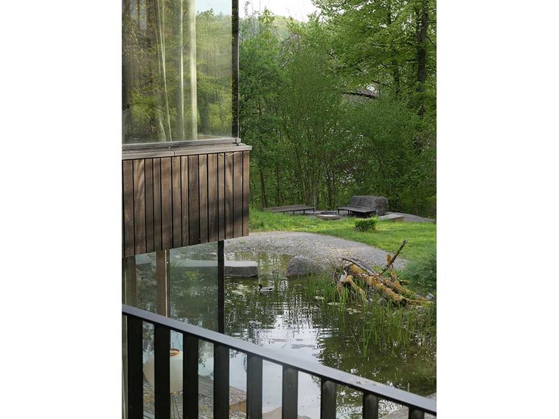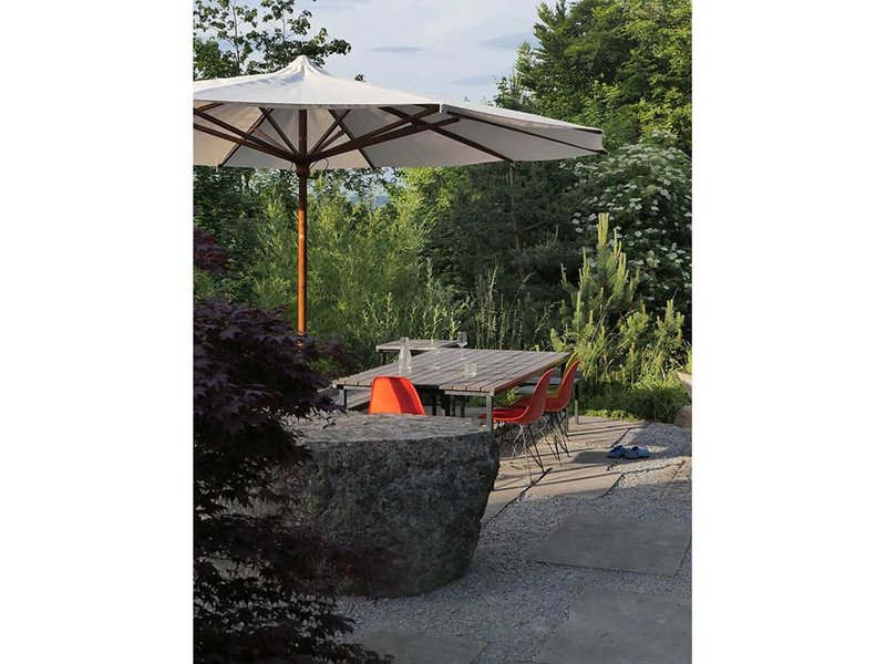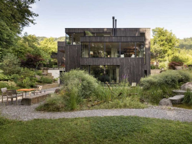 Dass der Garten wild und naturnah gestaltet werden sollte, war von Anfang an gesetzt. «Noch bevor wir wussten, welches Holzbauunternehmen wir beauftragen würden, stand der Landschaftsgärtner fest», erklärt der sympathische Bauherr. Und bekundet, dass er die Holdener Gartenbau GmbH vor allem auch deshalb sehr schätze, weil sie ein Händchen dafür hat, Architektur und Natur sensibel miteinander in Einklang zu bringen. Was sich hier einmal mehr beweist: Der Garten mit Naturteich, geschwungenen Kieswegen und Findlingen aus der Umgebung schafft einen harmonischen Brückenschlag zum angrenzenden Wald.