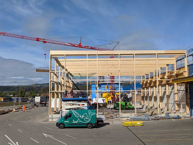 Die Kuratle Group ist ein wichtiger Player auf dem Markt der Bau- und Holzwerkstoffe. Jüngst hat das in den 1950er-Jahren gegründete Familienunternehmen in die Zukunft investiert: mit drei neuen Industriehallen am Hauptsitz in Leibstadt. Im Tragwerk der Konstruktionen kommt genau das zum Zug, worauf die Firma spezialisiert ist: Holz.