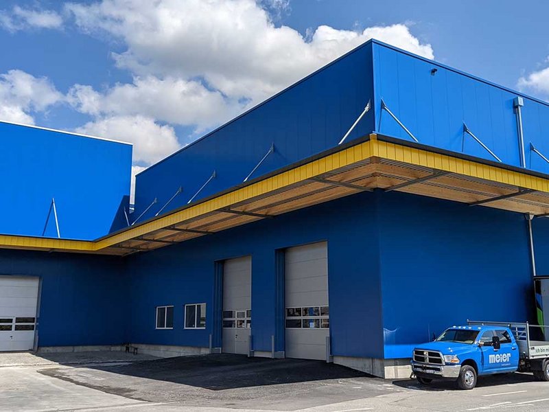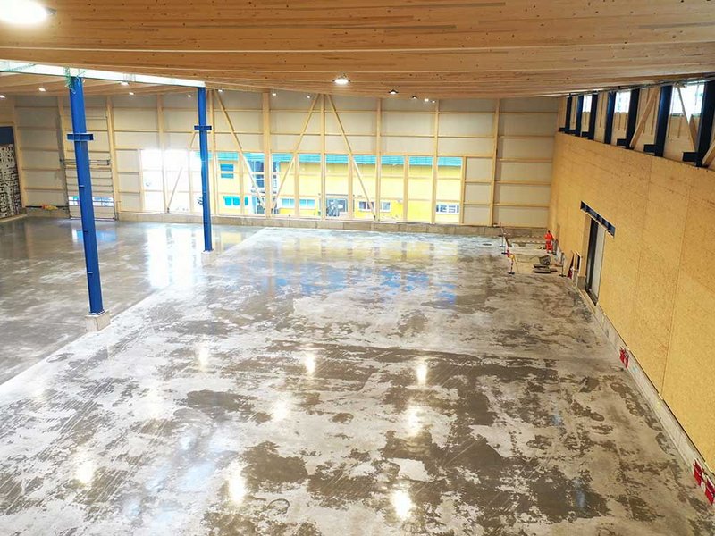 «Mach was mit Holz» – so lautet der Slogan der Kuratle Group. Nachdem George Kuratle die von seinem Vater 1955 gegründete Unternehmung in den 1980er-Jahren übernommen hatte, förderte er konsequent den Werkstoff Holz und prägte die Branche massgeblich mit seinen innovativen Ideen. Auch in der dritten Generation wird die Holzbauweise weiter gelebt und umgesetzt. So wurden in den vergangenen Monaten bei den drei Hallen rund 1300 Kubikmeter Holz verbaut – und überall da, wo es möglich war, kam Schweizer Holz zum Einsatz. Wichtig war den Verantwortlichen, dass die neuen Lagerhallen auch mit einer Kranbahn genutzt werden können, was eine statische Vorbereitung der Kranbahnauflieger erforderte. Zudem sollten die Bauwerke über eine beheizte Lagerfläche verfügen. Für die gewünschte Wärme von unten sorgt heute eine Fussbodenheizung, die von 20 Zentimetern Stahlfaserzementbeton überdeckt ist. Die übrige Wärmeleistung erbringt die mit Rest- und Abfallholz befeuerte Heizung auf dem Areal. Die Konstruktion der Halle 11 besteht aus Brettschichtholzbindern und Giebelwänden mit Brettschichtholz. Bei den Hallen 8 und 9 kommen dann noch längsseitige Stahlstützen hinzu: Sie tragen die erwähnte Kranbahn. Die Wände sind aussen mit den markant blauen Sandwichelementen eingedeckt. Die darunterliegende Wandkonstruktion setzt sich aus einer mit Steinwolle gedämmten Ständerkonstruktion und OSB- beziehungsweise Dreischichtplatten zusammen. Die aus Duo- und Brettschichtholz konstruierten Flachdächer mit einer Neigung von 1,5 Prozent sind mit einer leistungsstarken Photovoltaikanlage eingedeckt.