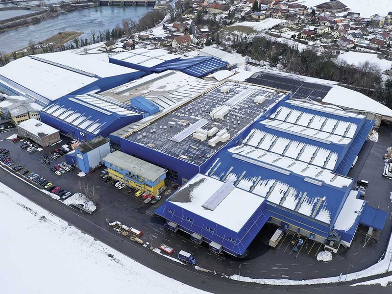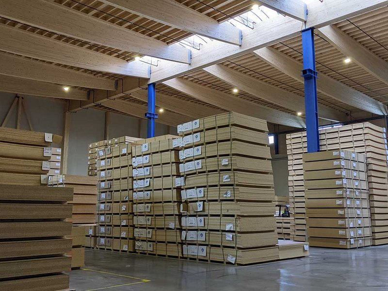 Das Ortsbild der Gemeinde Leibstadt im Aargau prägen zwei Landmarken: der Kühlturm des Kernkraftwerks Leibstadt und ein markantes Industriegebiet. Markant, weil die Hallen in Blau auf dem weitläufigen Areal die sonst sehr ländlich-dörfliche Kulisse kontrastieren. Auf einer Fläche von 90 000 Quadratmetern hat hier eines der wichtigsten Drehkreuze der Schweizer Holzwirtschaft seinen Hauptsitz: die Kuratle Group. Das Handels- und Logistikunternehmen mit rund 750 Mitarbeitenden legt den Schwerpunkt auf die verarbeitende Holz-, Holzbau-, Küchen-, Möbel-, Boden- und Parkettindustrie. Das Industrieareal in Leibstadt entstand in den 1970er-Jahren und wurde damals vorwiegend zur Spanplattenherstellung genutzt. Nach dem Kauf des Areals Anfang der 1990er-Jahre erneuerte die Kuratle Group sukzessive diverse Hallen, um sie dem Stand der Technik anzupassen und einer neuen Nutzung zuzuführen. Zur aktuellsten Modernisierung auf dem Gelände gehören die 2020/2021 erfolgten Arbeiten am Gebäudepark: Die in die Jahre gekommenen Hallen 8, 9 und 11 wurden durch entsprechende Ersatzneubauten in Holzbauweise ersetzt. Die Hallen dienen der Lagerung. Zudem wurde im Zuge der Modernisierung und Optimierung eine Teilfläche durch technische Aufwertung der Gebäudeinfrastruktur neu auch für industrielle Vorfertigungsprozesse nutzbar gemacht.