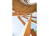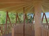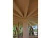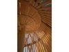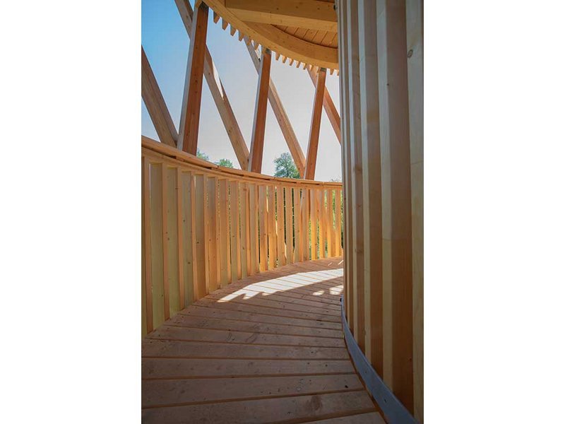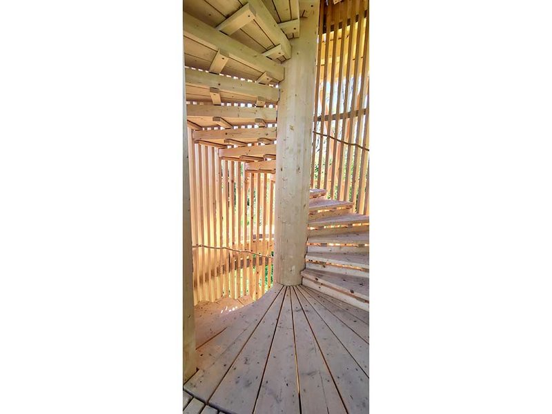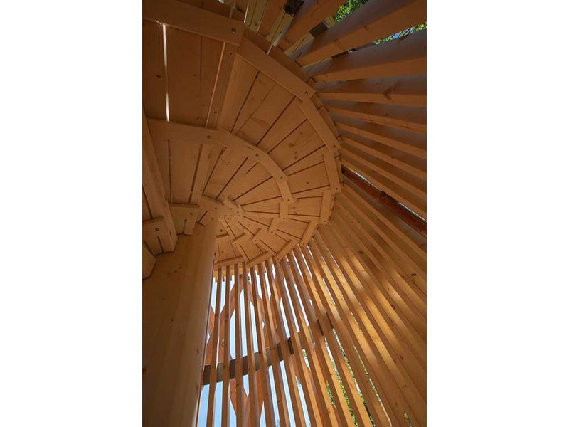 Die massive Spindel in der Mitte ist nicht nur statisches Bauteil der Treppe, sondern stützt gleichzeitig auch das Dach. Dessen Tragwerk besteht hierbei aus Balken, die sternförmig von der Mitte aus zum Dachrand verlaufen. Gleichzeitig halten die Balken die Tragwerksstäbe gegen innen, die ansonsten nach aussen hin ausbrechen würden. Bei der Treppe ist es ausserdem so, dass die Stäbe, die den Treppenaufgang einfassen, einerseits die Absturzsicherung bilden, andererseits aber auch Teil des Tragwerks sind. Die einzelnen Stufen sind jeweils innenseitig an der Spindel und aussenseitig an den Stäben montiert. Dadurch lassen sich die Stufen bei Bedarf einfach einzeln austauschen.