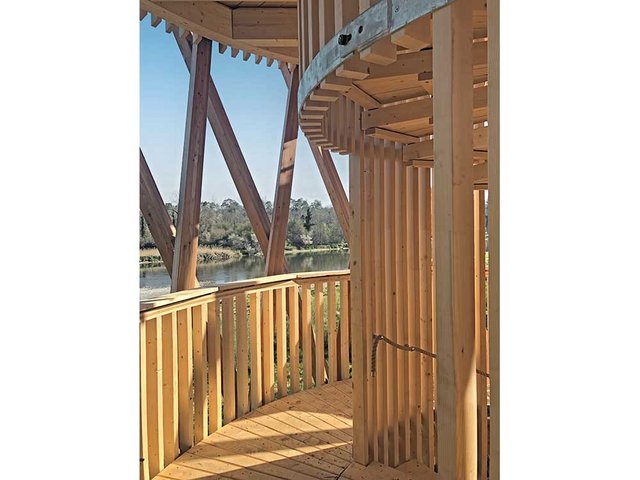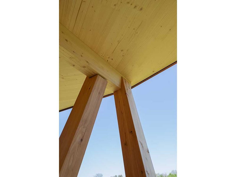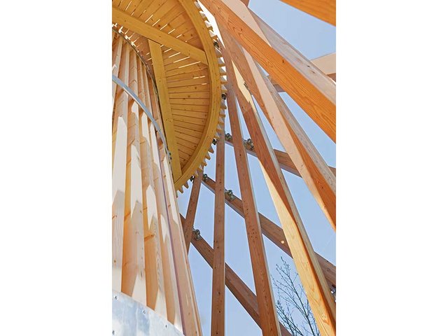 Zum einen war es allgemein der Holzschutz. Die Vorgabe war, dass wir unbehandeltes Holz verwenden sollten. Das hatte entsprechend Einfluss auf die Wahl der Holzart. Für das äussere Stabtragwerk wählte ich Lärche, weil das Holz witterungsbeständiger ist als Buche oder Eiche. Hierbei war wesentlich, dass die Stirnholzseiten geschützt sind, denn longitudinal – also in Längsrichtung zum Stamm – zieht Wasser am besten ins Holz ein. Für die Konstruktion bedeutete das, dass die Stäbe oben gut abgedeckt sein müssen. Darum kragt das Dach hier auch aus. Unten sitzen die Stäbe in rund 35 Zentimetern Höhe auf Stahlfüssen, um genügend Abstand zur Fundation zu haben und nicht dauerhaft im Nassen zu stehen. Auch bei den Verbindungen zwischen den einzelnen Stäben ist es wichtig, dass das Wasser dort gut abfliessen kann und keine Feuchtenester entstehen. Auf der Innenseite des Turms wurde hauptsächlich Fichte verwendet. Wobei die Treppenstufen und die Plattformen, auf denen die Besucher auch mal mit nassen Schuhen laufen, bei Bedarf leicht ausgebaut und ersetzt werden können.