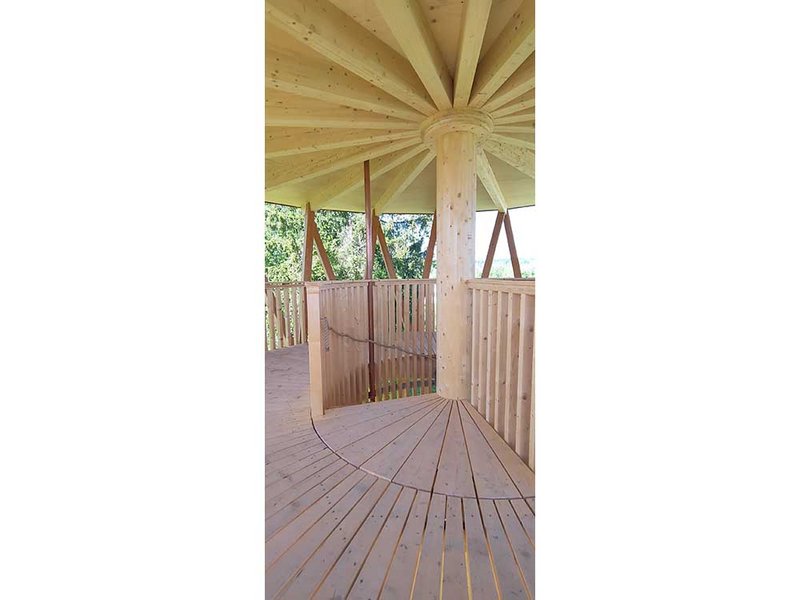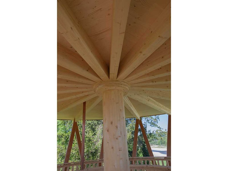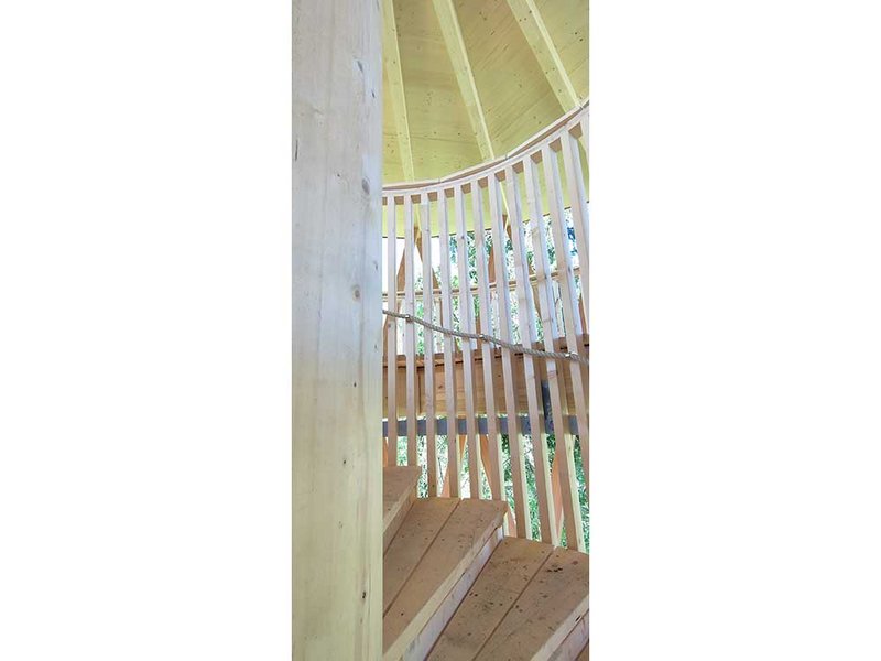 Holz: BSH Lärche (Gitterschale), BSH Fichte (Spindel, Podest, Dachträger), Fichte massiv