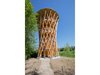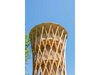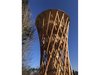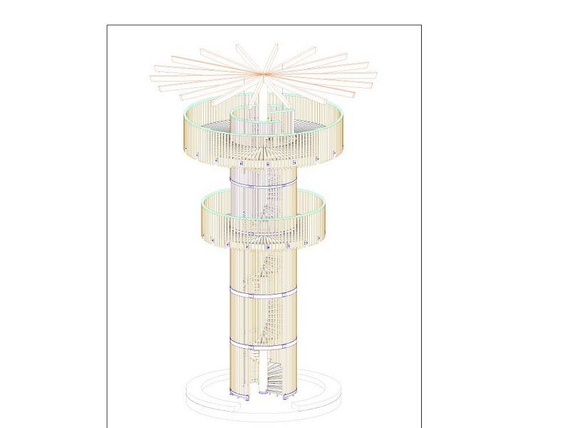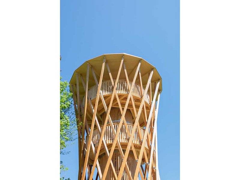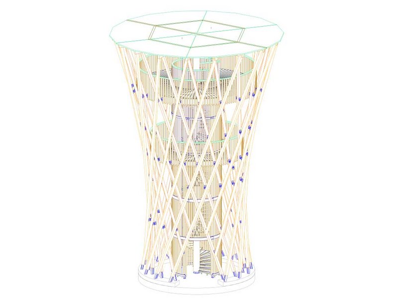 Ich hatte einen dynamischen Zylinder vor Augen – einen Körper wie einen leicht verdrehten Ast oder Baum. Dann stellte sich die Frage, wie man das umsetzen kann. Und so kam die Figur eines Hyperboloids ins Spiel. Vom Prinzip her entsteht die Form wie beim Mikado – wenn man einen Haufen Stäbe in der Mitte zusammenhält, spreizen sie oben und unten etwas auseinander. Ich fing an, mit dieser Form zu spielen und mir Gedanken über die Details zu machen: Aus wie vielen Stäben soll der Hyperboloid bestehen? In welchem Winkel sollen die Stäbe stehen? Wo soll der engste Punkt des Baus sein? Dabei galt es, nicht nur die Statik zu berücksichtigen, sondern auch die Nutzung. Die Plattformen mussten beispielsweise auf bestimmten Höhen sein, und zwischen den Stäben sollte man gut hindurchschauen können.