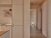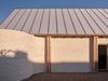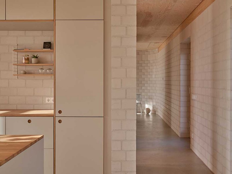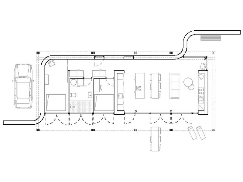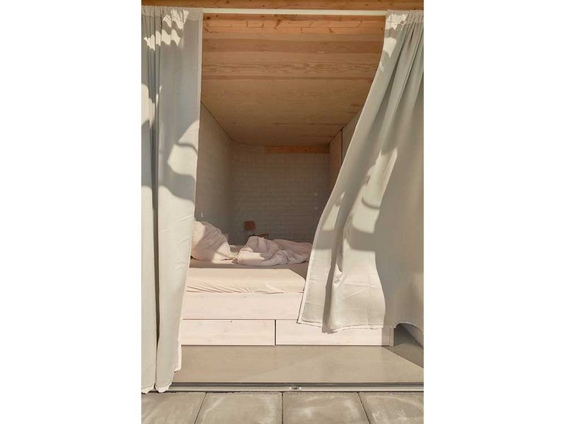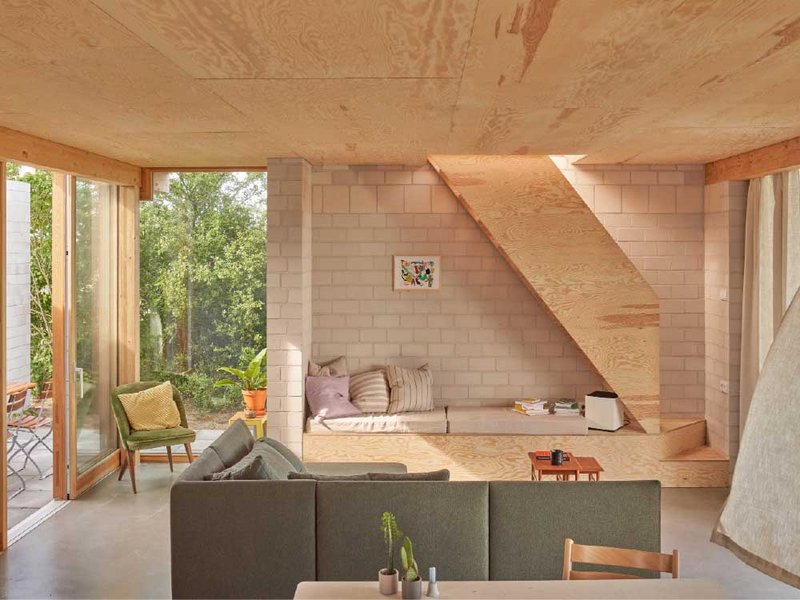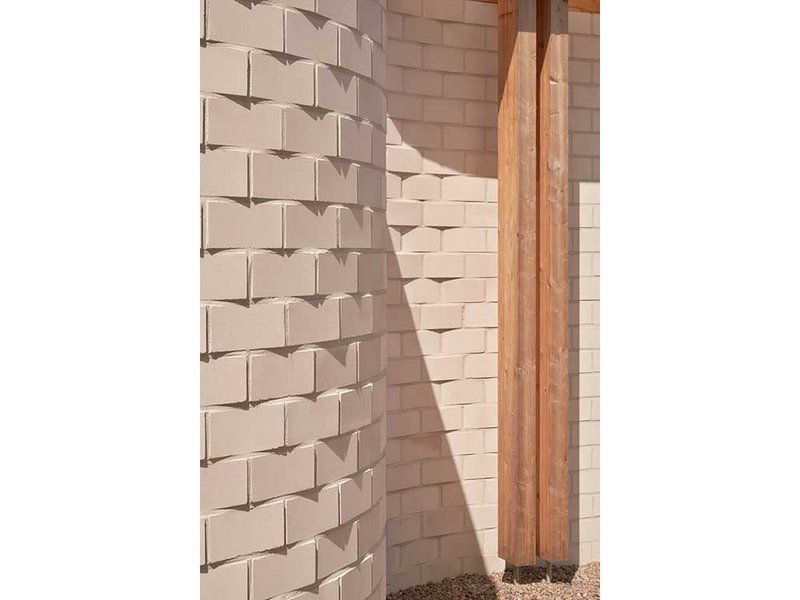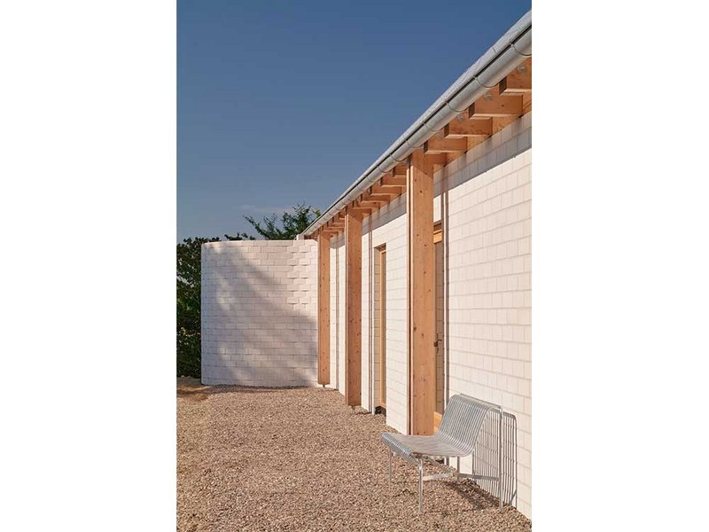 Das 113 Quadratmeter grosse Erdgeschoss ist in mehrere Räume unterteilt: einen gemütlichen Wohnbereich mit offener Küche, zwei kleine Schlafzimmer (sie sind gerade mal so breit, wie das Bett lang ist) und ein Bad. Alle Räume orientieren sich dabei nach Westen und öffnen sich mit doppelflügeligen Glastüren zur überdachten Terrasse. Rückseitig zur Strasse schottet sich der Bau mit einer Fassade aus Sichtmauerwerk ab. Die Wand läuft dabei jeweils in Form einer geschwungenen Mauer im Aussenbereich weiter und definiert an einem Ende eine windgeschützte Sitzecke, am anderen Ende einen Autostellplatz.