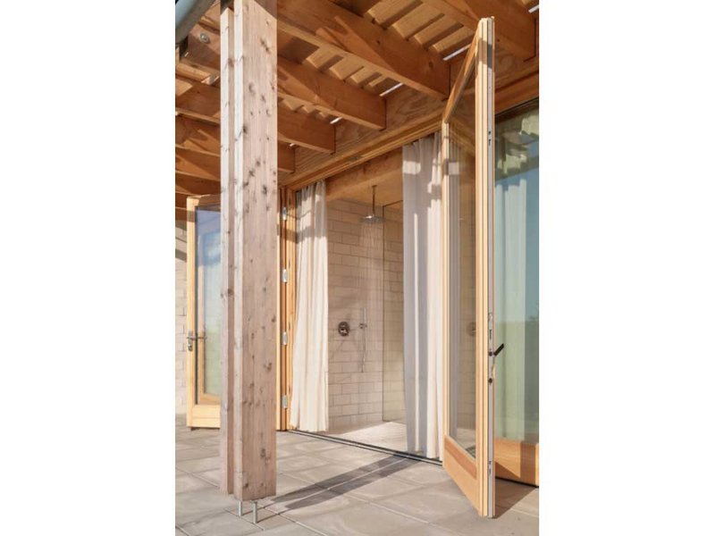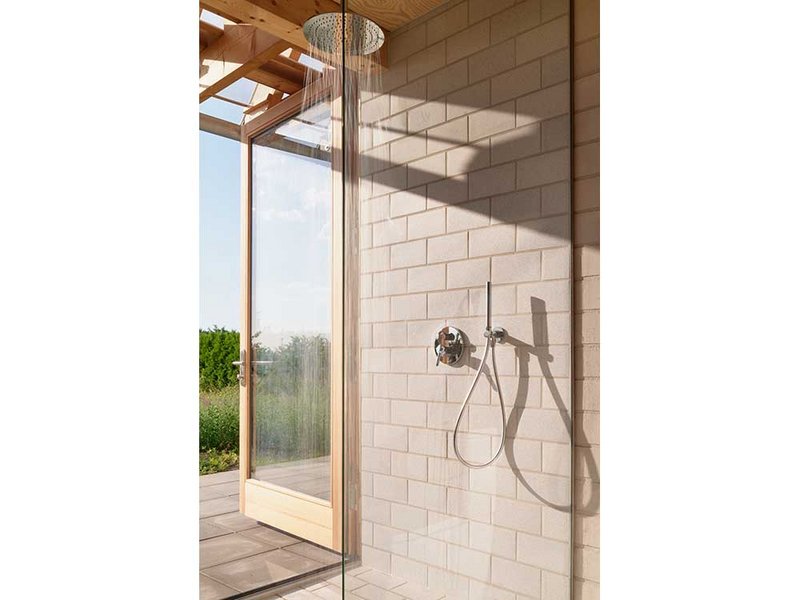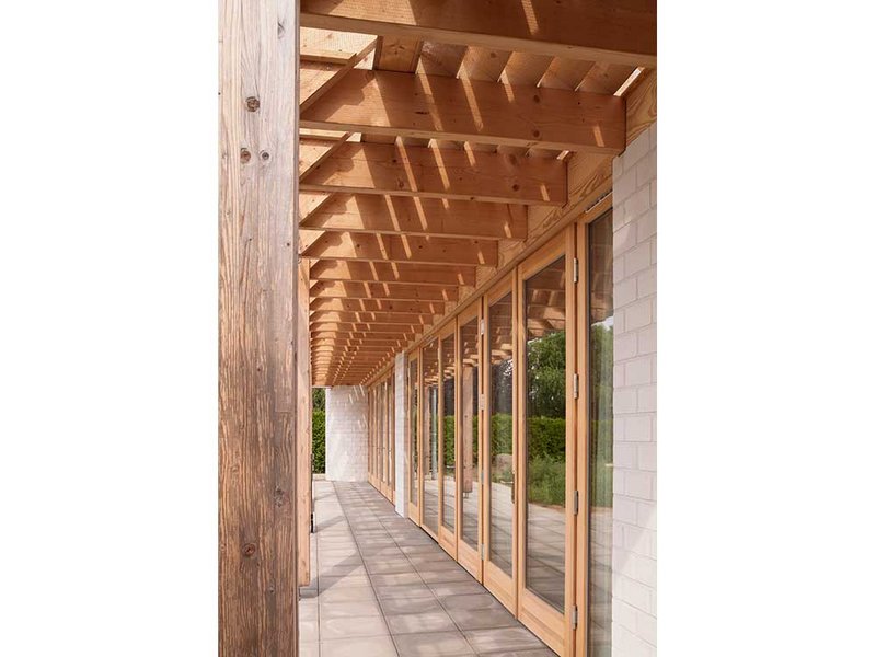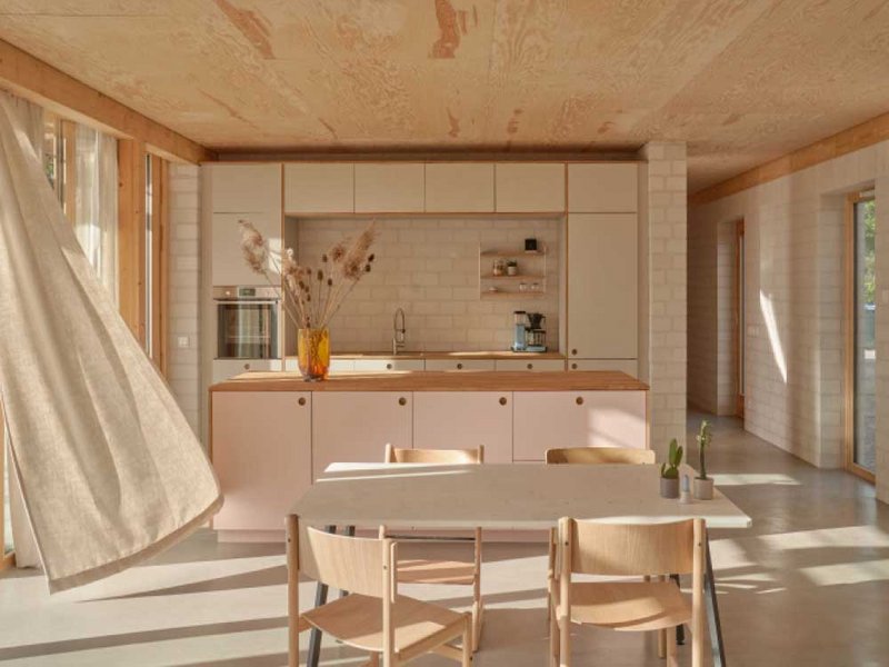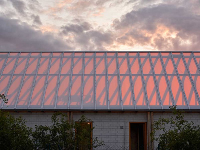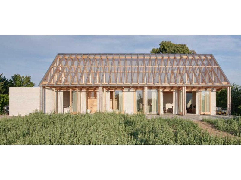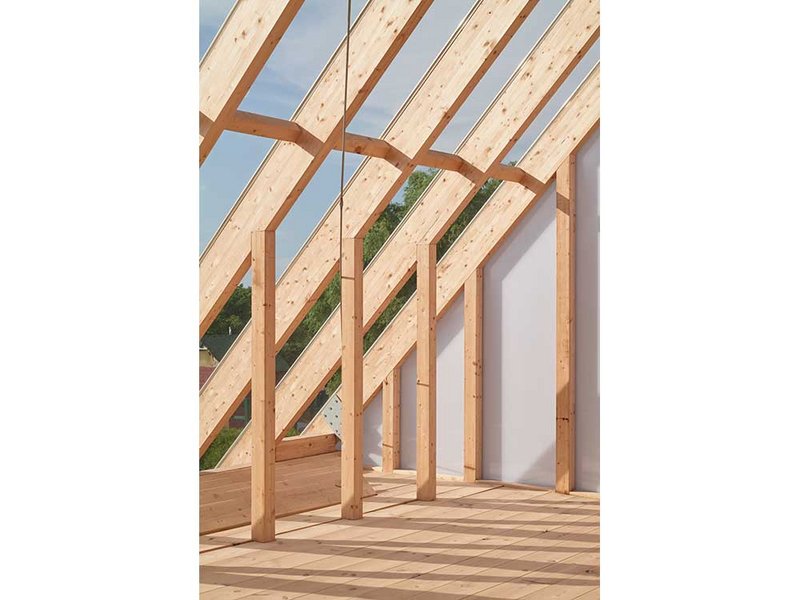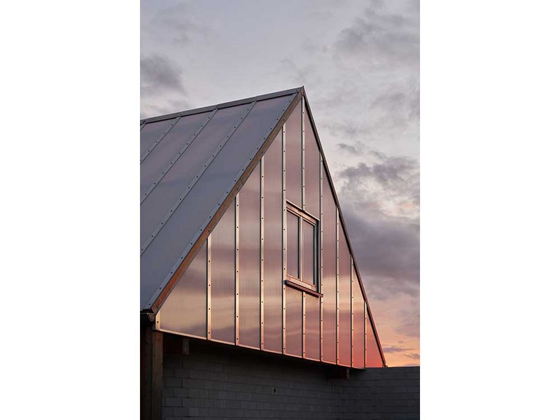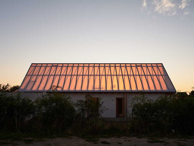 Was in der Regel im Verborgenen liegt, wurde bei diesem Haus bewusst offengelegt: die hölzerne Dachkonstruktion mit Sparren. Statt Ziegel bildet hier Glas beziehungsweise Polycarbonat die Dachhaut, die vor Witterung schützt und gleichzeitig Ein- und Ausblicke gewährt. Für die Dachfläche Richtung Strasse wurden transluzente Polycarbonatplatten verwendet, für die gegenüberliegende Dachfläche transparentes Glas. So bietet sich von dort aus ein fantastischer 180-Grad-Blick auf die uckermärkische Landschaft, die sich nordöstlich von Berlin erstreckt. Schaut man von aussen auf das Gebäude, lässt sich der 70 Quadratmeter grosse Dachraum – definiert durch seine Sparrenlage – in seiner Gesamtheit erfassen. Genutzt wird dieser ungedämmte Teil des Hauses als Gewächshaus – oder als Atelier im Frühling und Herbst, wenn die Temperaturen etwas gemässigter sind.
