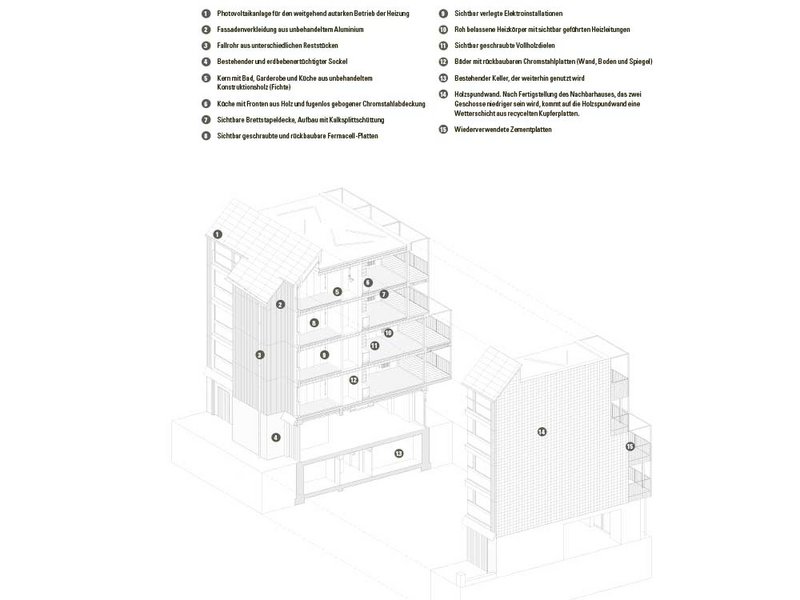 Ganz im Sinne des Prinzips «Urban Mining» wurden möglichst wenig Bauteile miteinander verklebt oder dauerhaft verbunden, sodass die Materialien sortenrein bleiben und später als Sekundärrohstoffe nutzbar sind. So kamen beispielsweise Brettstapeldecken mit unbehandelter Oberfläche zum Einsatz, bei denen die einzelnen Holzteile nur mit Buchendübeln verbunden sind. Und anstelle eines mehrschichtig aufgebauten
