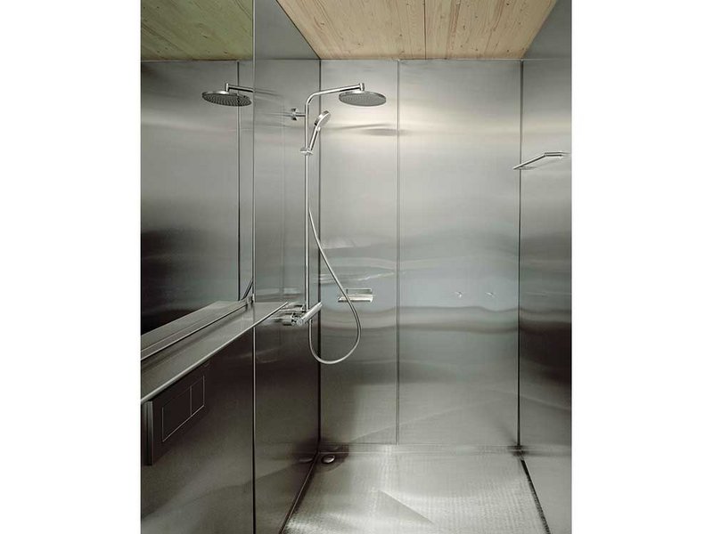 Dort, wo Metall zum Einsatz kam und auf die Expertise der Spenglerei zurückgegriffen werden konnte, wurde besonders viel getüftelt und ausprobiert. Das Bad besteht beispielsweise komplett aus Chromstahlplatten, die als hinterlüftete Elemente an der Wand lediglich eingehängt sind. Fugendichtungen gibt es nicht. Dafür nimmt die Konstruktion entsprechend etwas mehr Platz in Anspruch. Doch das war der Bauherrschaft die konsequente Haltung, das Material sortenrein zu verwenden, allemal wert. Selbst der Spiegel besteht aus reinem Chromstahl, wenngleich auf Hochglanz poliert. Bei genauer Betrachtung lassen sich – im Vergleich zu herkömmlichen Glasspiegeln – leichte Wellen erkennen.