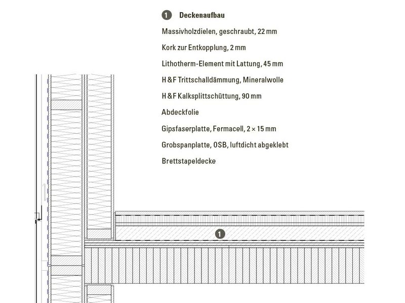 Jede Idee konnte allerdings nicht umgesetzt werden. Manches scheiterte schlichtweg aufgrund behördlicher Auflagen und Normen. Jenseits gebauter Routine ist es eben schwer mit Bürokratie und Gesetzen. Beispiel Decken: Eigentlich wurde hier auf Brettstapeldecken mit einer Beschwerung aus Stampflehm gesetzt – und das Ganze anhand von Mock-ups getestet. Schallschutznormen machten dem Vorhaben dennoch einen Strich durch die Rechnung. Um die vorgegebenen Trittschallwerte zwischen den Wohnungen zu erreichen, brauchte es schlichtweg mehr Masse. Am Ende wurde es ein Brettstapeldeckenaufbau mit Kalksplittschüttung.