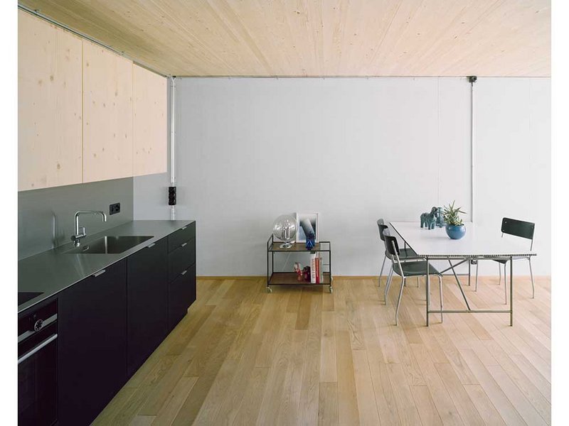Für die Aufstockung schwebten der Bauherrschaft, Familie Jäggi, zunächst gestapelte Schiffscontainer vor – etwas Einfaches, an dem auch weitergebaut werden kann. Bloss kein High End, lautete die Devise, denn das Gebäude sollte später rückbaufähig sein. Statt Schiffscontainer bilden nun vorgefertigte und lediglich verschraubte Holzelemente die Tragstruktur.