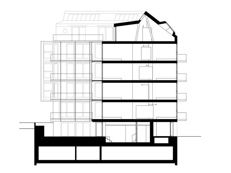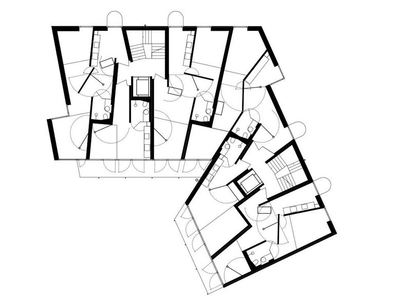 Das Gebäude umfasst insgesamt 30 Wohnungen, die – mit einer Ausnahme im Erdgeschoss – alle nur zwischen 26 und 54 Qua­dratmeter gross sind. Im Gegensatz zu den mittleren Regelgeschossen sind im Erd- und im Dachgeschoss die Grundrisse allerdings klassisch aufgeteilt, hier lässt sich also nichts drehen und wenden.