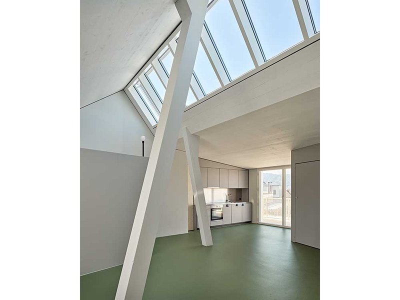 In der Aussenansicht ist die Holzkonstruktion als solche nicht sichtbar, innen aber schon. Die Decken sind weiss, die Wände in einem hellen Grauton lasiert. So bleibt die Struktur des Materials ablesbar, was zum wohnlichen Raumeindruck beiträgt. Die zwölf Zentimeter dicken Brettsperrholzwände sind tragend und leiten die Lasten jeweils auf die unteren Geschosse ab. Um zu vermeiden, dass dort, wo eine Wand auf einer Geschossdecke aufliegt, das Holz zusammengedrückt wird – also Querholzpressungen entstehen –, werden die Lasten über Buchendübel abgetragen. Sechs Zentimeter Durchmesser haben diese.