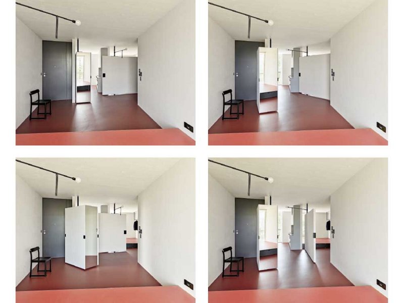 Das Mock-up wurde aber nicht nur erstellt, um die Gebäudekonstruktion im Vorfeld zu testen, sondern auch die drehbaren Elemente. Potenziell stark beansprucht, müssen sie viel aushalten können und sollten in der Handhabung gut funktionieren. Wie und wie oft künftige Bewohner die schwenk- und drehbaren Raum­elemente nutzen, wurde dabei im Mock-up auf dem Hönggerberg im Langzeittest untersucht. Über eineinhalb Jahre lang wurde das Testgebäude von verschiedenen Probanden je eine Woche bewohnt – von Studenten bis zu Rentnern –, um dabei zu ergründen, wie unterschiedliche Nutzergruppen mit dem flexiblen Raumangebot umgehen. Sensoren, die in die beweglichen Bauteile integrierte ware, gaben darüber Aufschluss, wie häufig und wie stark die Elemente bewegt wurden.