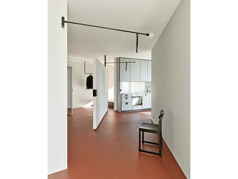 Die Frage, wie qualitativ hochwertiger Raum auf kleiner Fläche entstehen kann, beantworten die Zürcher Gestalter wie folgt: Man löse konventionelle Zimmerstrukturen (weitgehend) auf, indem man feststehende Wände durch Wandscheiben ersetzt, die sich an einem Stahlrohr azentrisch um ihre eigene Achse drehen. Dadurch wird ein Maximum an Flexibilität geschaffen. Wohnbereiche lassen sich mit nur einem Schwenk verkleinern, vergrössern oder einfach umarrangieren. Selbst Stauraum nimmt als mobiles Volumen Einfluss auf den Grundriss. Die verspiegelten Schränke sind ebenfalls als drehbare Elemente definiert. Schlaf- beziehungsweise Sitzpodeste mit integrierten Schubladen und Bodenklappen schaffen zudem eine abwechslungsreiche Topografie, die den Grundriss auch vertikal belebt – und darüber hinaus weiteren Stauraum generiert. Was der Idee der Architekten Rechnung trägt, dass es beim Einzug nicht viel Mobiliar benötigt. Wer will, zieht einfach mit kleinem Gepäck ein.