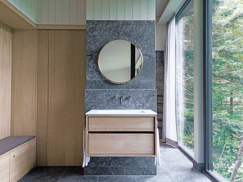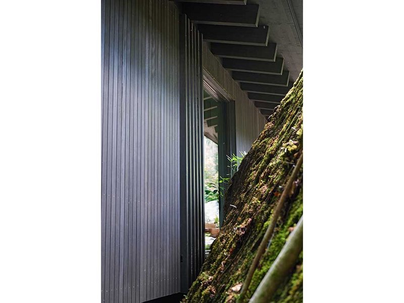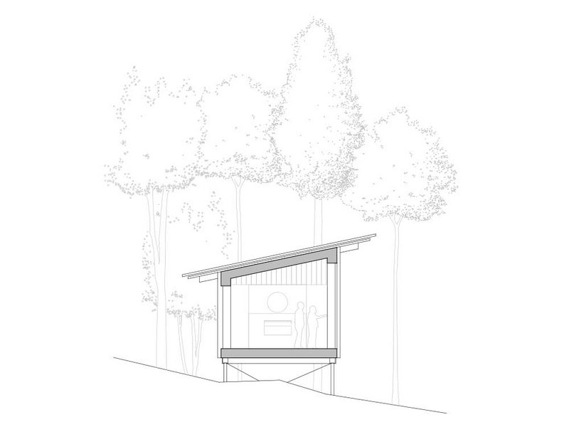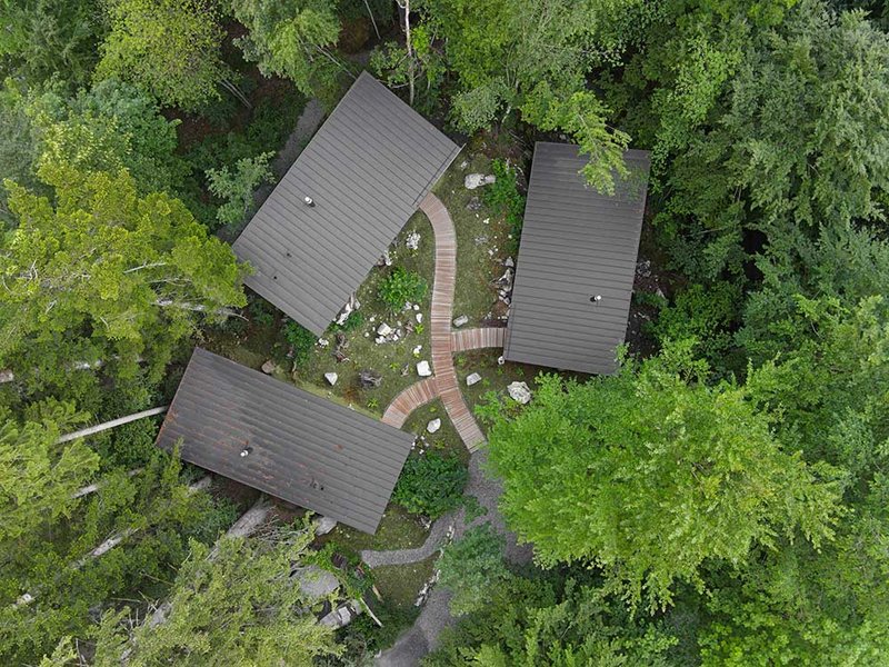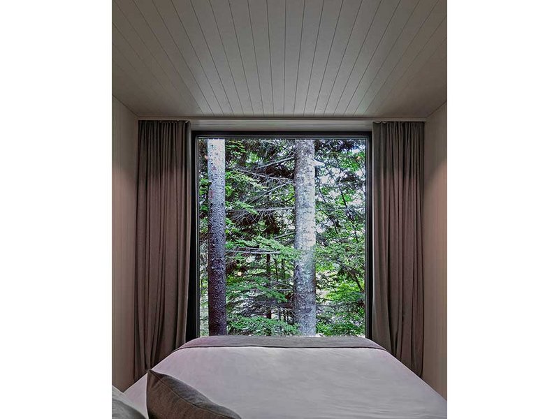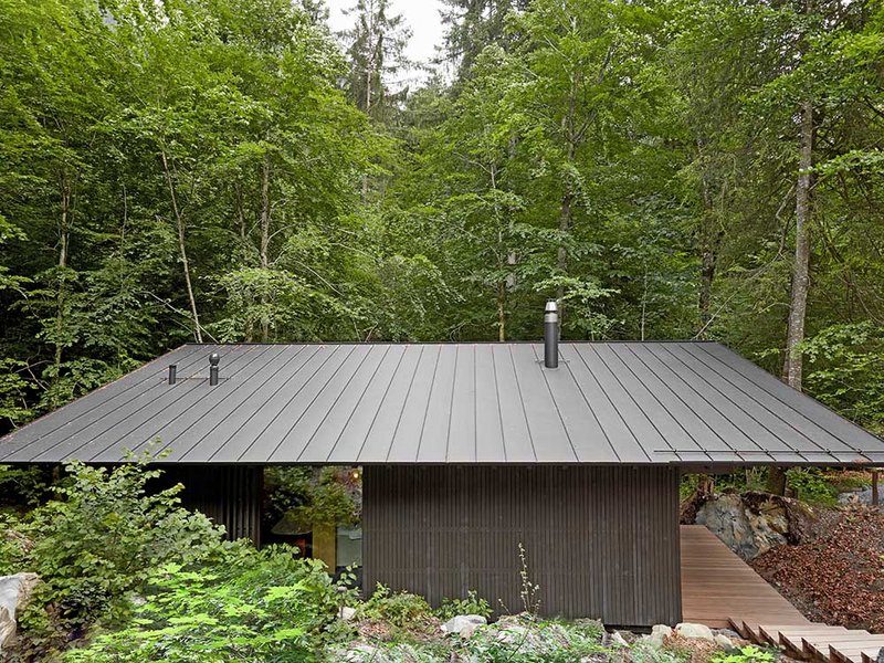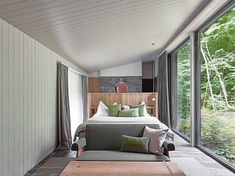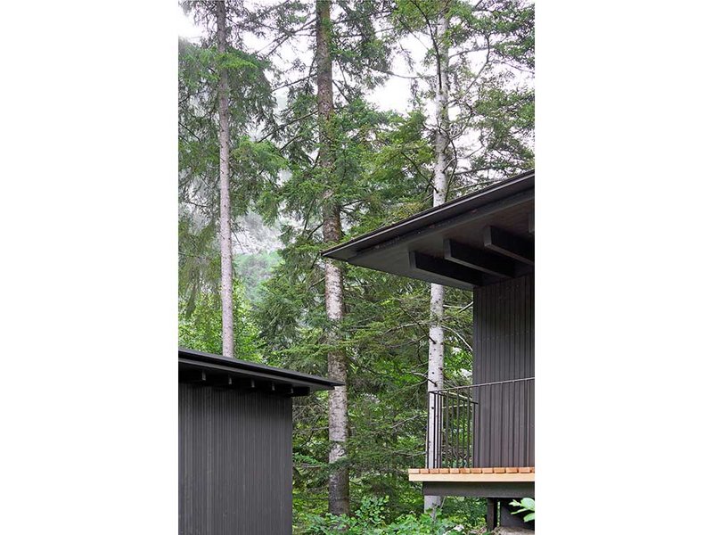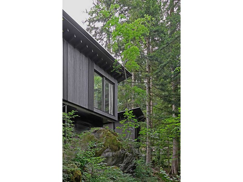 Zwischen Bäumen und mit Moos überwachsenen Felsen entstanden drei kleine Holzbauten für jeweils zwei Personen. Die Gebäude stehen als kleine Gruppe beieinander, allerdings so ausgerichtet, dass sie sich gegenseitig keine Einblicke gewähren. Auch dort, wo der öffentliche Wanderweg unmittelbar vorbeiführt, wurde auf die Wahrung der Privatsphäre geachtet. «Entweder das Gebäude schwebt einige Meter oberhalb des Weges, oder die entsprechende Fassadenseite ist fensterlos», erklärt Stefan Amann, Projektleiter im Architekturbüro Hildebrand Studios. «Die Gäste selbst haben zwar wunderbare Ausblicke, wohnen aber trotzdem sehr privat.» Eine enge Verbindung zwischen Mensch und Natur zu schaffen, war denn auch der Leitgedanke, der diesen Entwurf prägt.