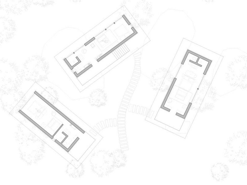 Die Bebauung der Waldparzelle war nicht leicht. Bauherrschaft und Architekturbüro wollten die Natur möglichst wenig tangieren, was beim Entwerfen eine besondere Herangehensweise erforderte. «Wir haben zunächst die Position jedes einzelnen Baumes erfasst, dann wurden die drei Häuser entsprechend dazwischengesetzt», rekapituliert der verantwortliche Architekt. «Kein grösserer Baum wurde für das Bauprojekt gefällt, lediglich ein paar kleinere Sträucher mussten weichen.»